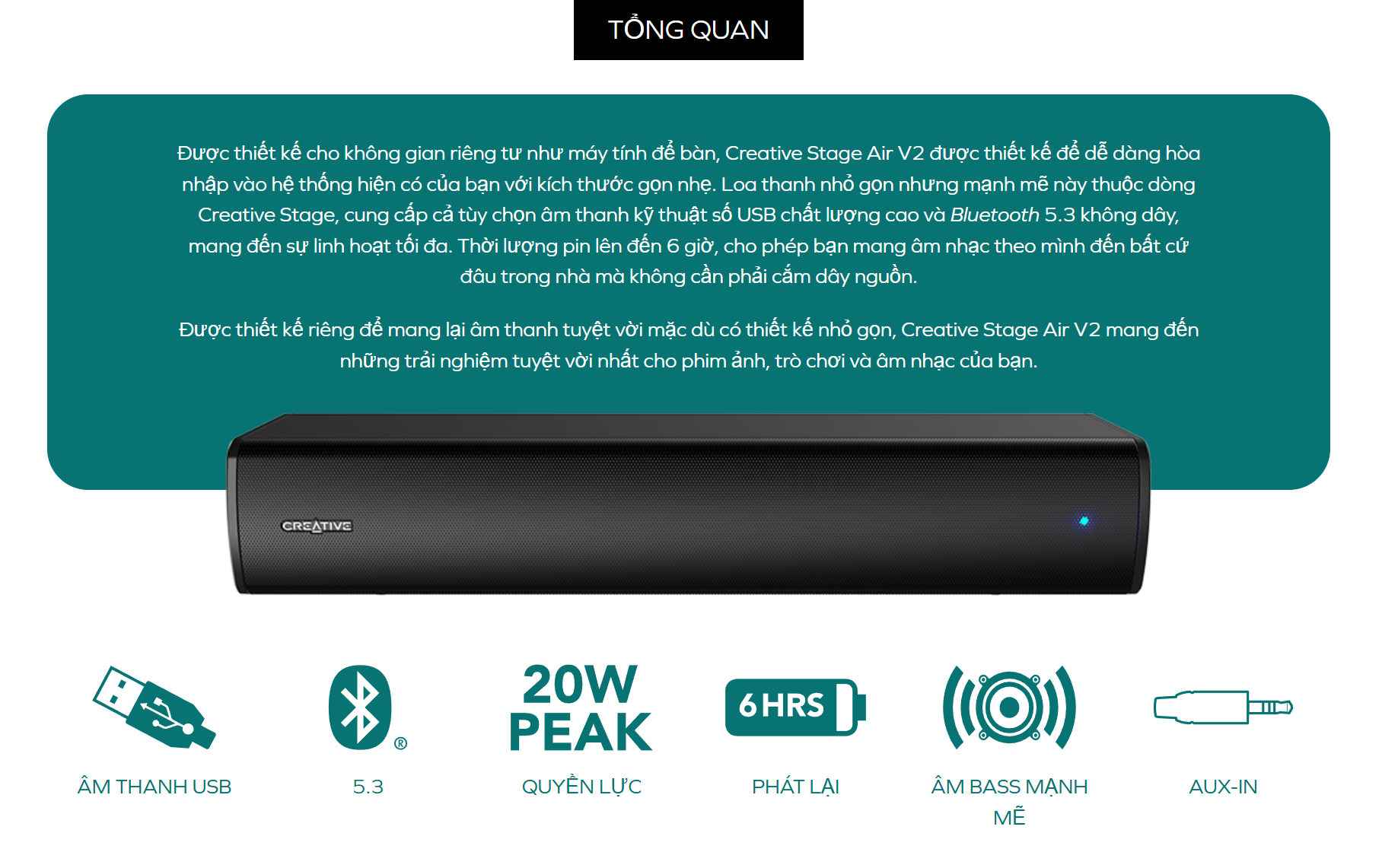 Loa Creative Stage Air V2 Soundbar là giải pháp âm thanh di động và nhỏ gọn, hoàn hảo để đặt dưới màn hình máy tính hoặc mang theo. Sản phẩm được nâng cấp với khả năng kết nối không dây Bluetooth 5.3 và USB Audio, cung cấp âm thanh mạnh mẽ với công suất đỉnh 20W. Với thiết kế soundbar một mảnh, thời lượng pin lên đến 6 giờ và đa dạng cổng kết nối, Stage Air V2 là người bạn đồng hành lý tưởng cho cả không gian làm việc tĩnh tại và các chuyến đi dã ngoại.