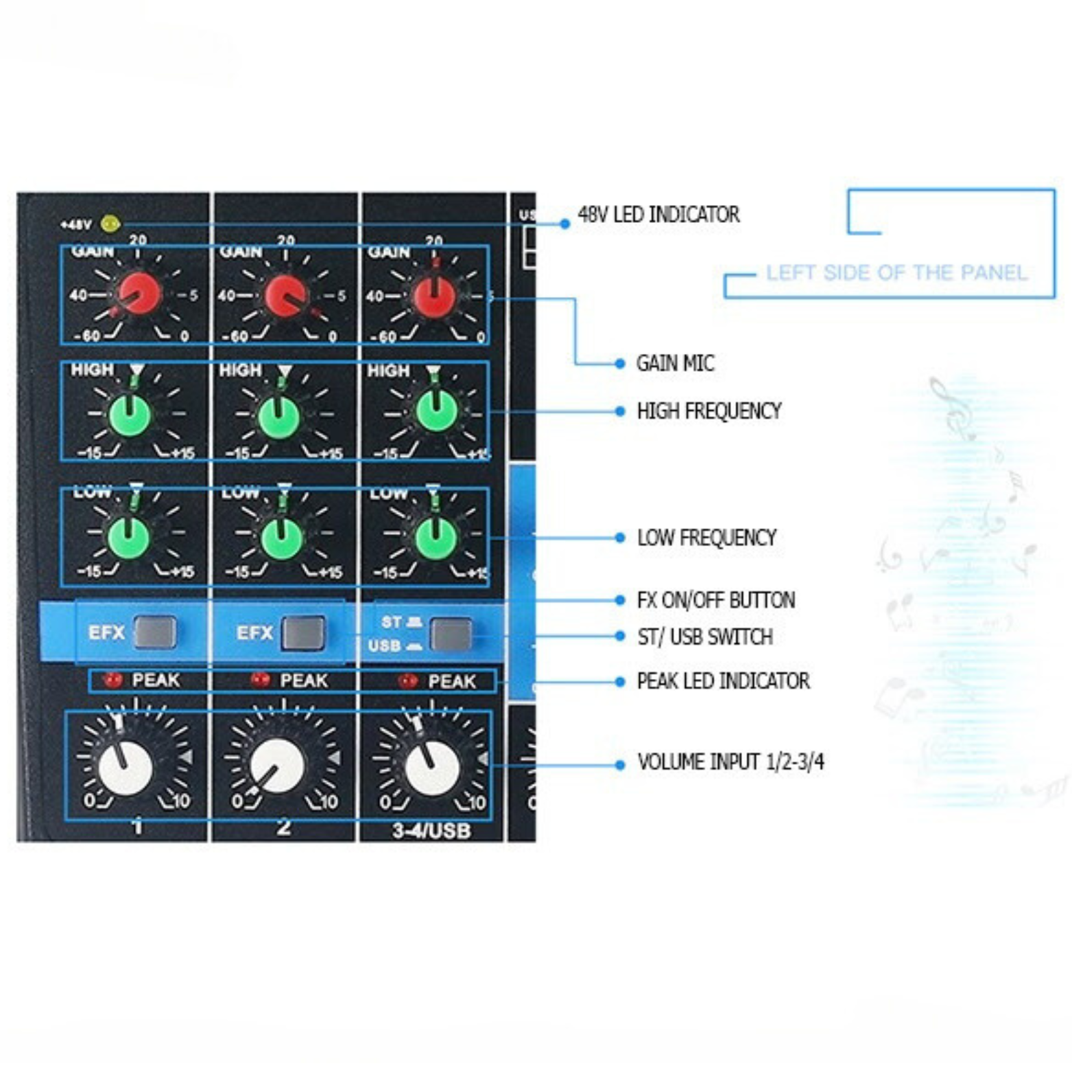 - Tinh chỉnh dải tần High/Mid/Low cho microphone.