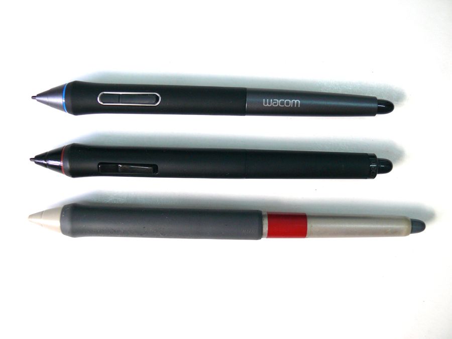 So sánh bút của Cintiq 13HD và Intuos 5, Intuos 3, ngoàihình dáng gọn và thiết kế đẹp mắt, về trọng lượng, bút của Cintiq 13HD còn có vẻ nhẹ hơn hẳn so với các loại kia.