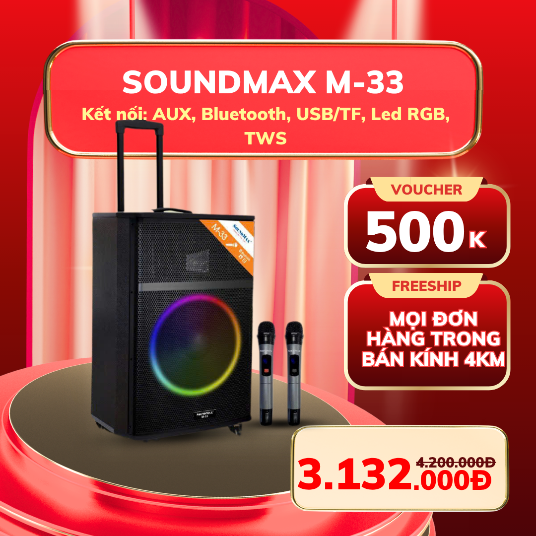SoundMax M33 là mẫu loa kéo được nhiều gia đình lựa chọn nhờ âm thanh lớn, dải bass rõ, treble sáng, dễ hát karaoke. Thiết kế hiện đại, có tay kéo và bánh xe giúp di chuyển linh hoạt.