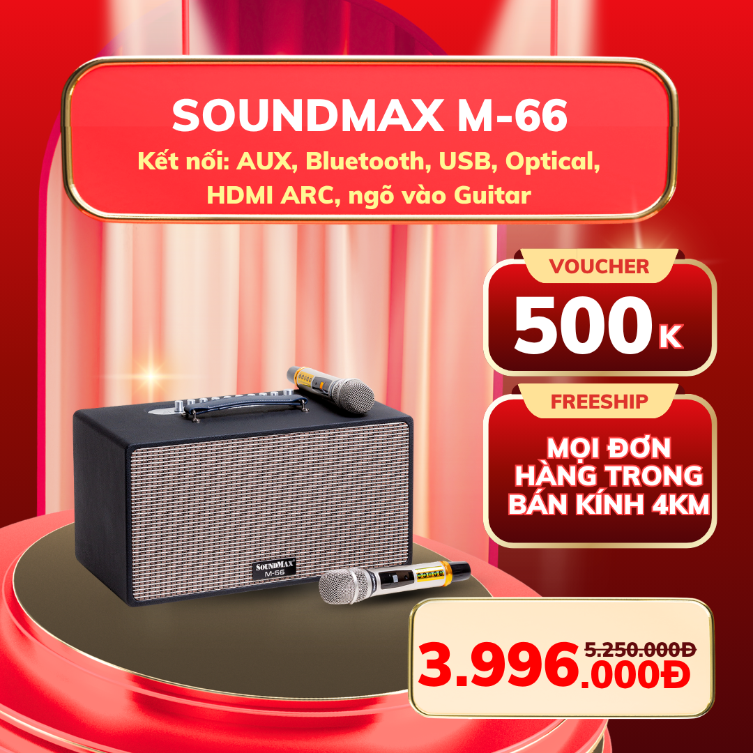 SoundMax M-66 mang đến chất âm ổn định, công suất lớn, phù hợp sân vườn, tiệc đông người hoặc các buổi gặp mặt ngoài trời dịp Tết.