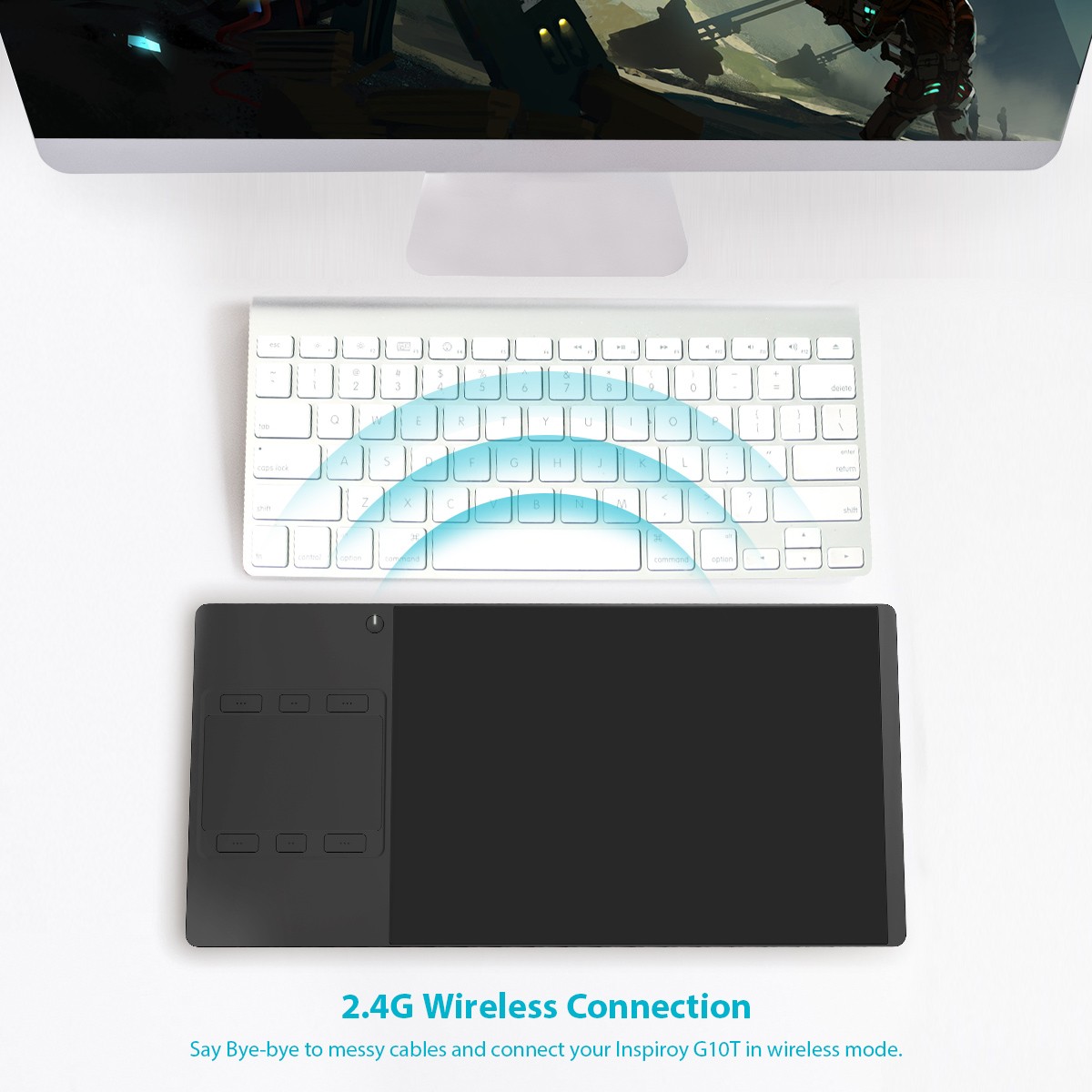Inspiroy G10T đi kèm bộ kết nối wireless chuẩn 2.4GHz, công việc thiết kế nay càng thoải mái hơn khi không còn vướng víu những sợi cáp trên bàn làm việc.