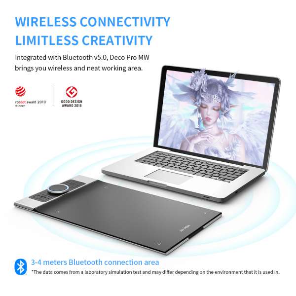 NHƯNG, Deco Pro wireless bổ sung tính năng Kết nối không dây cực kỳ đắt giá cho phép người dùng không còn vướng bận việc cắm dây lằng nhằng, giúp cho góc làm việc gọn gàng hơn. Đặc biệt hơn, Deco Pro wireless là dòng bảng vẽ đầu tiên trên Thế giới hỗ trợ đến 2 hình thức kết nối không dây: Bluetooth 5.0 và USB 2.4GHz nên có thể tương thích với mọi loại máy tính!