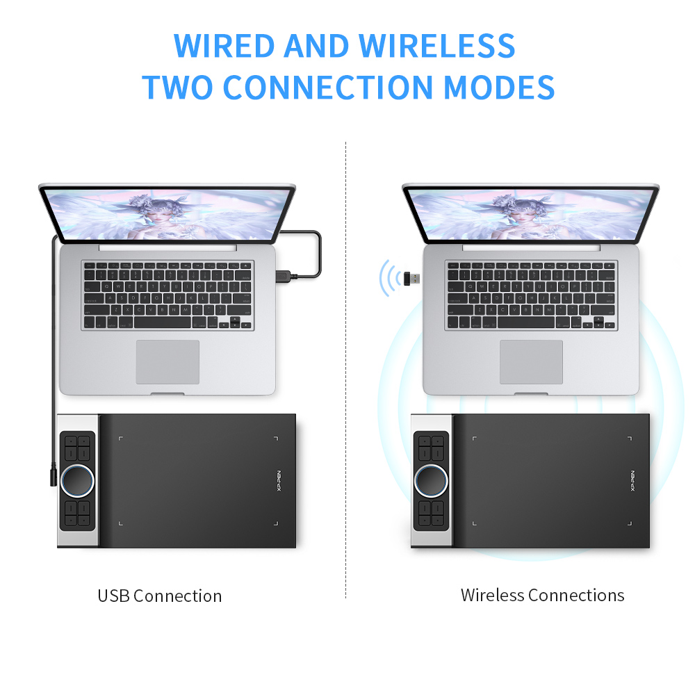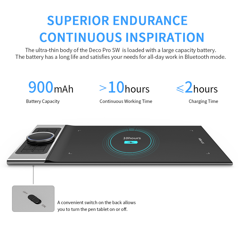 NHƯNG, Deco Pro wireless bổ sung tính năng Kết nối không dây cực kỳ đắt giá cho phép người dùng không còn vướng bận việc cắm dây lằng nhằng, giúp cho góc làm việc gọn gàng hơn. Đặc biệt hơn, Deco Pro wireless là dòng bảng vẽ đầu tiên trên Thế giới hỗ trợ đến 2 hình thức kết nối không dây: Bluetooth 5.0 và USB 2.4GHz nên có thể tương thích với mọi loại máy tính!
