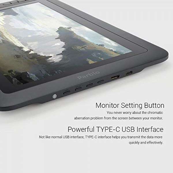 Bảng vẽ Parblo Coast13, không cần nguồn cấp điện rời, màn hình TFT 13.3in, tỷ lệ 16:9, Full HD 1920×1080, 100% sRGB, độ phân giải bảng vẽ 5080lpi, bút vẽ không pin 8192 mức lực nhấn, kết nối HDMI/USB-C
