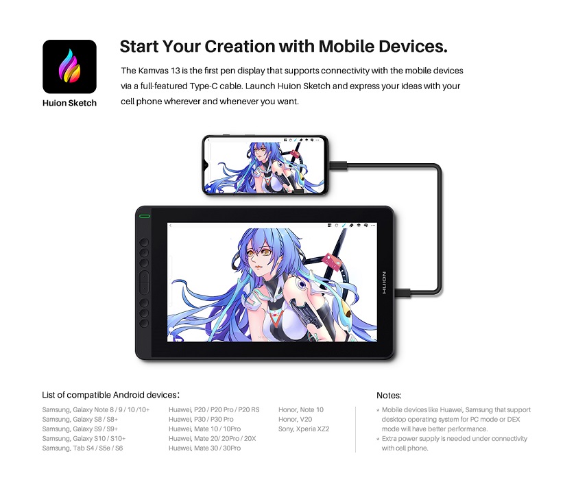 Bảng vẽ LCD Huion Kamvas 13 (Android), màn hình IPS 13.3in, full HD 1920×1080, tỷ lệ 16:9, độ phân giải bảng vẽ 5080lpi, bút vẽ PW517 không pin 8192 mức lực nhấn, cảm ứng ±60° nghiêng, kết nối USB-C. Hai chế độ sử dụng, bảng vẽ/bảng vẽ LCD.