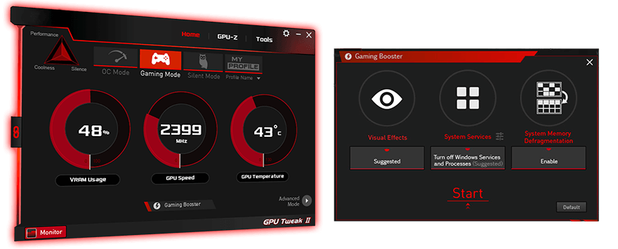 Tiện ích ASUS GPU Tweak II hỗ trợ điều chỉnh cạc đồ họa lên một đẳng cấp mới. Tiện ích này cho phép bạn tinh chỉnh các tham số quan trọng bao gồm các thiết lập xung lõi GPU, xung bộ nhớ và điện áp, cùng tùy chọn để theo dõi mọi thứ theo thời gian thực thông qua hiển thị trên màn hình có thể tùy biến được. Điều khiển quạt nâng cao cũng được trang bị cùng với nhiều tính năng để giúp bạn khai thác tối đa cạc đồ họa gaming của bạn.