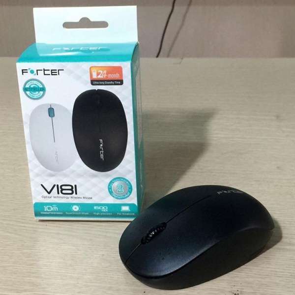 Chuột không dây Forter V181 màu đen sử dụng pin AA thông dụng.