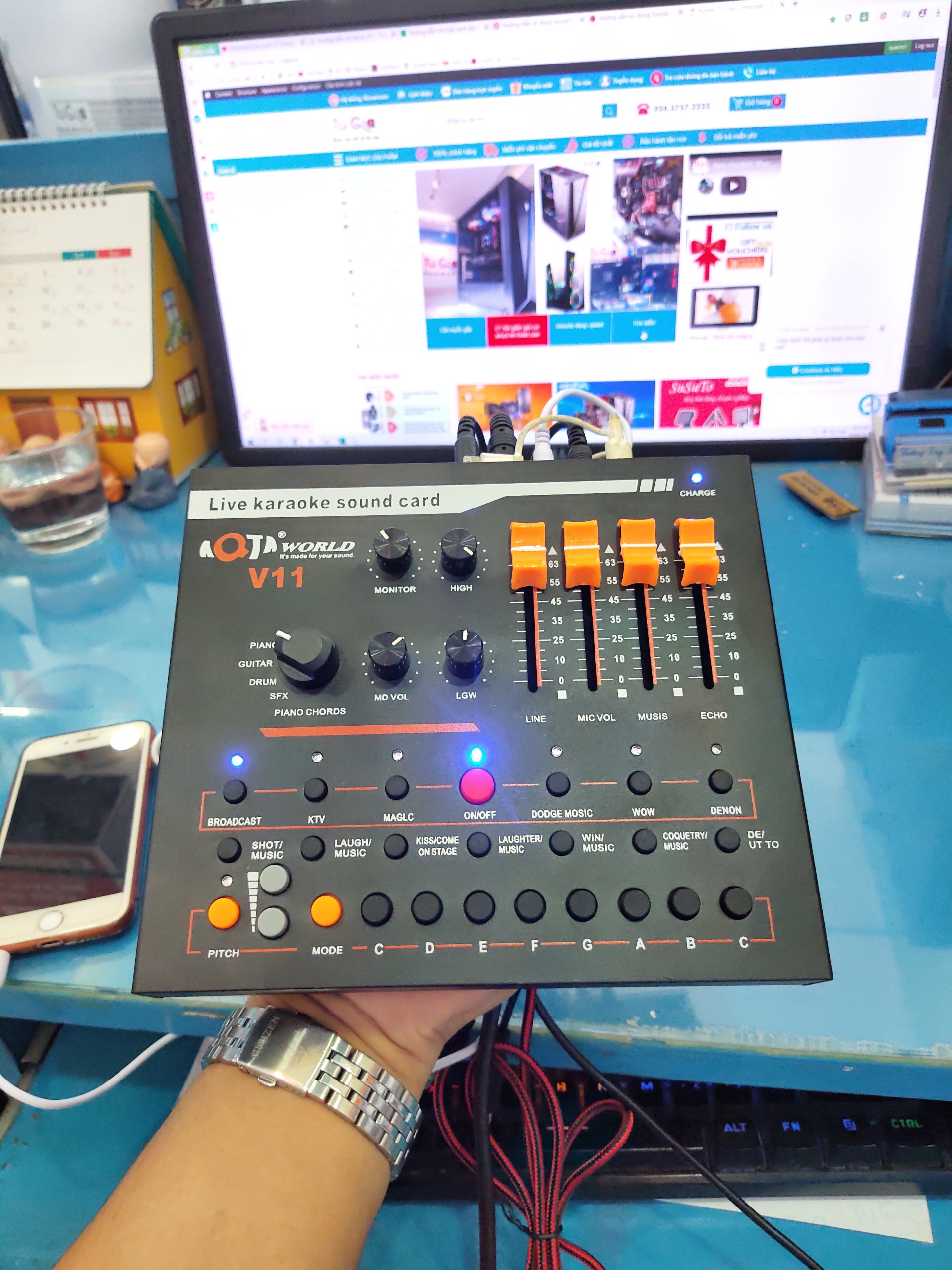 Sử dụng Sound Card V11 cũng khá đơn giản nhưng với anh chị mới thì hơi lạ lẫm 1 chút vì sound card V11 có thiết kế và thêm những chức năng mới so với các phiên bản trước như v8, v9, v10. Sound Card V11 là phiên bản mới nhất của hãng AQTA được cung cấp tại thị trường Việt Nam từ đầu năm 2019 với thiết kế đặc biệt nhìn đẹp hơn các nút gạt hiệu chỉnh âm thanh ( đầu ra, âm lượng mic, âm lượng nhạc, độ vang ) nhìn như các nút gạt của bàn Mixer nhìn có vẻ chuyên nghiệp và sử dụng cũng dễ hơn. Sử dụng V11 với chức năng âm thanh chơi nhạc cụ ( guitar, piano, drum, sfx, ) hay kết nối với điện thoại để thu âm livestream cũng khá đơn giản với bài viết này có cả hình ảnh và video chi tiết để anh chị có thể sử dụng bộ hát thu âm livestream sound card V11 nhé.
