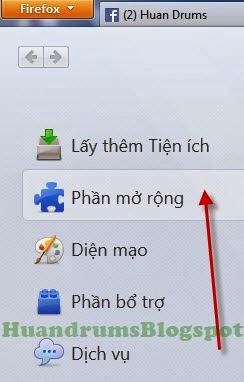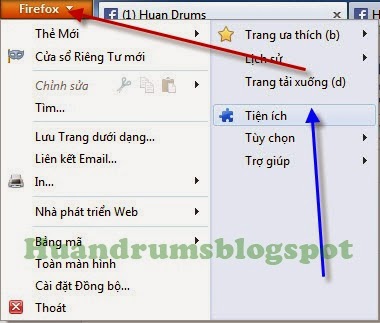 Bấm vào chữ Firefox bên góc trái trên(Mũi tên đỏ) sau đó bấm vào Tiện ích(Mũi tên xanh)