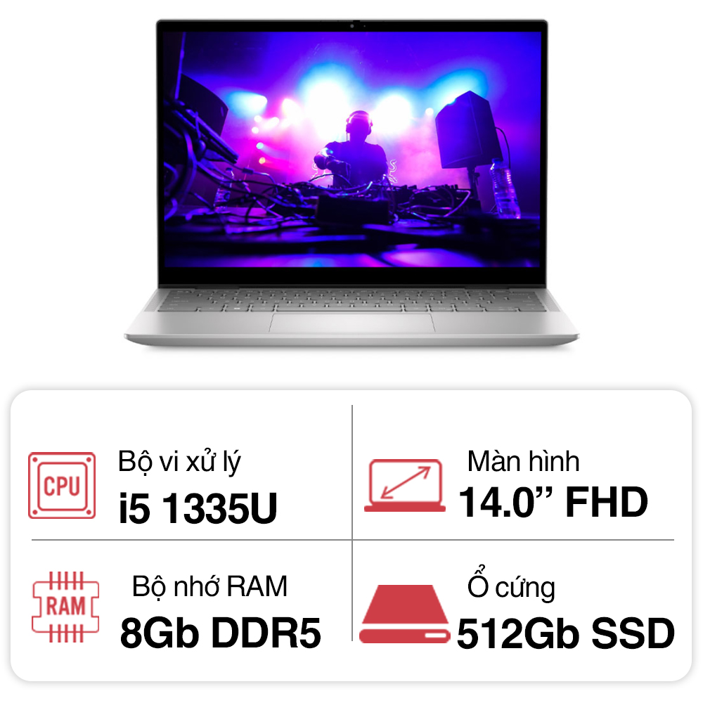 Laptop Dell Inspiron T7430 N7430I58W1 (Core i5 1335U/ 8GB/ 512GB SSD/ Intel Iris Xe Graphics/ 14.0inch Full HD+ Touch/ Windows 11 Home + Office Student/ Silver/ Vỏ nhôm/ Pen/ 1 Year)