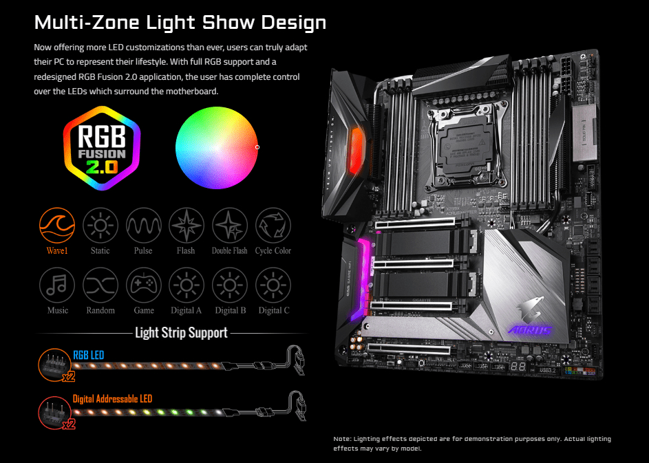 Bạn có thể thoải mái tùy chỉnh hệ thống đèn LED RGB trên Main Gigabyte X299X AORUS MASTER nhờ phần mềm RGB FUSION 2.0 với hơn 16 triệu tùy chọn màu. Hệ thống đèn LED được tích hợp ở phần thân thiết bị, mang lại cho card đồ họa một vẻ ngoài cực bắt mắt.