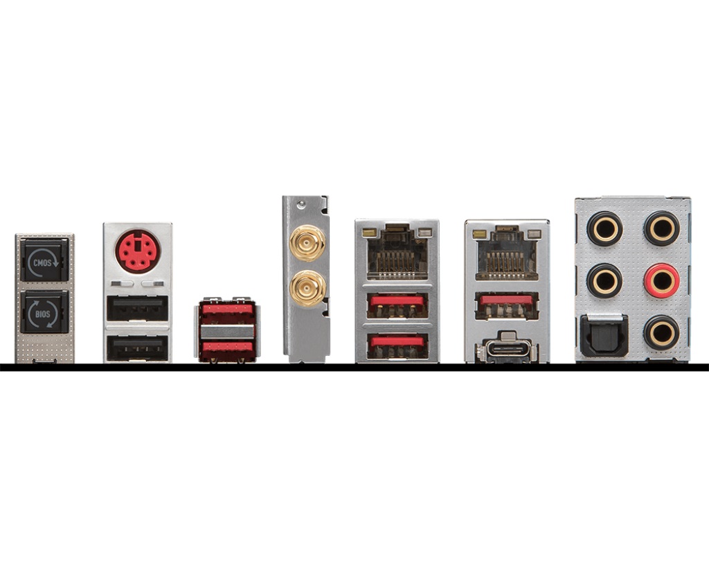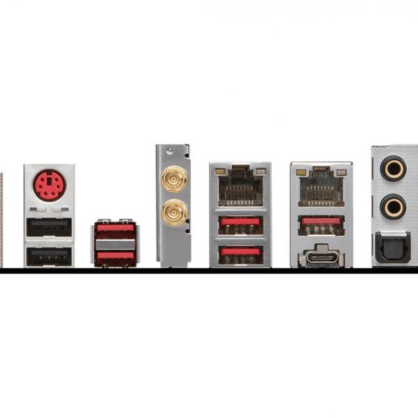 | Cổng giao tiếp ngoài | 1 x Clear CMOS button, 1 x BIOS FLASHBACK+ button, 1 x PS/2, 2 x USB 2.0, 4 x USB 3.1, 1 x USB 3.1 Gen2 Type-A port, 1 x USB 3.1 Gen2 Type-C port, 1 x Optical S/PDIF Out, 2 x Intel Wi-Fi & Bluetooth |