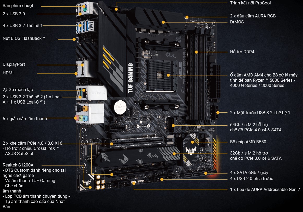 Mainboard ASUS TUF GAMING B550M-PLUS là sản phẩm bo mạch chủ chuyên dụng hơi game chuyên dùng cho các bộ xử lý AMD Ryzen ™ 5000 Series, 4000 G-Series, 3000 Series.