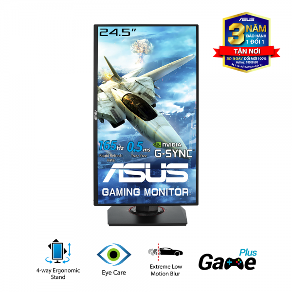 | Tính năng khác | Màn hình chuyên game 24.5” Full HD với tốc độ làm mới siêu nhanh 165Hz và công nghệ Adaptive-Sync để loại bỏ hiện tượng xé hình và gián đoạn tốc độ khung hình Được chứng nhận tương thích với G-SYNC, mang lại trải nghiệm chơi game liền mạch, không xé hình nhờ hỗ trợ VRR (biến thiên tần số làm mới). Thời gian đáp ứng 0,5ms* để chơi game mượt và Công nghệ ASUS Extreme Low Motion Blur (ELMB - Độ nhòe chuyển động siêu thấp) để giảm thiểu hơn nữa hiện tượng bóng ma và nhòe ảnh khi chuyển động Công nghệ GameFast Input giảm thiểu lag đầu vào và cung cấp khả năng hiển thị chuyển động nhanh hơn từ các thiết bị cuối đến màn hình |