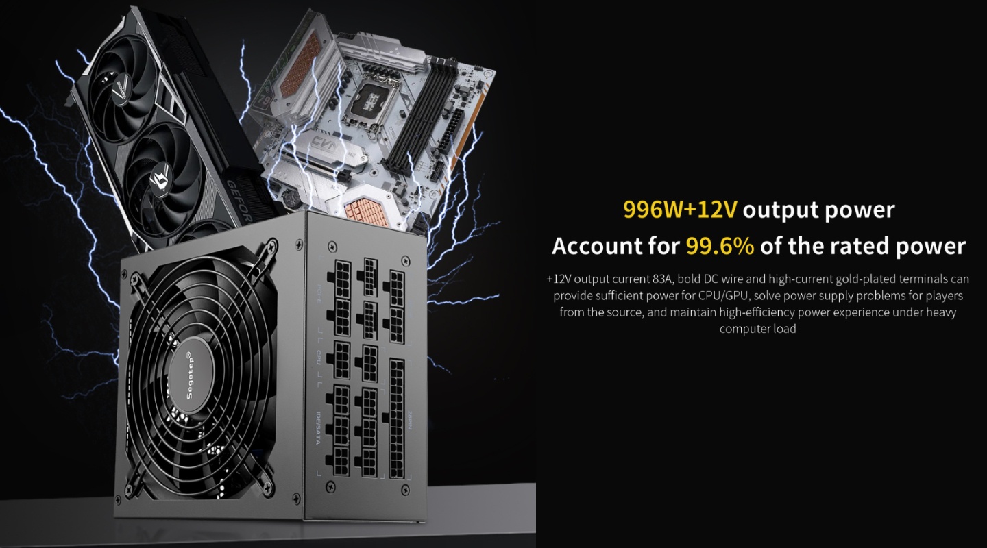 Nguồn Segotep GM1000W cung cấp dòng +12V với công suất lên tới 996W, chiếm 99.6% công suất danh định, đáp ứng nhu cầu điện năng cao cho các linh kiện quan trọng như CPU và GPU. Với dòng điện lên đến 83A trên đường +12V, kết hợp với dây DC dày và đầu nối mạ vàng chịu dòng cao, GM1000W đảm bảo cung cấp nguồn điện ổn định và đủ lớn, giúp người dùng giải quyết triệt để các vấn đề về nguồn điện trong các cấu hình cao cấp.