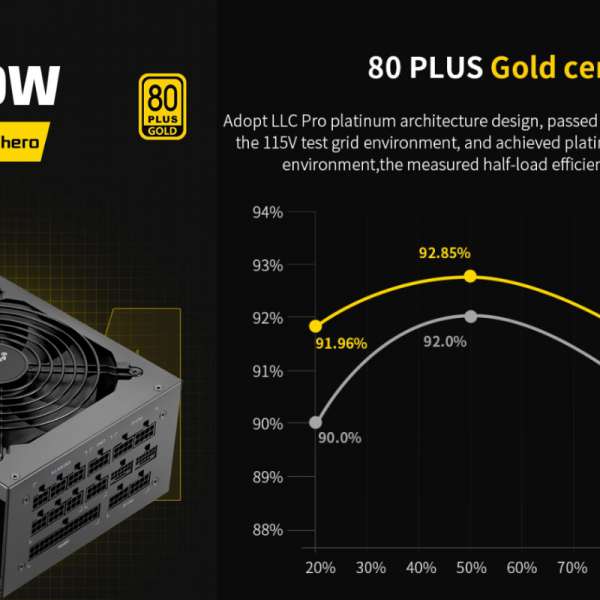 Áp dụng thiết kế kiến ​​trúc bạch kim LLC Pro, nguồn Segotep GM1000W đã vượt qua chứng nhận 80 PLUS Gold trong môi trường lưới thử nghiệm 115V và đạt hiệu suất Platinum trong môi trường lưới 230V, hiệu suất nửa tải đo được lên tới 92,85%.