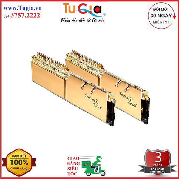 Giữ bộ nhớ luôn mát mẻ nhờ lớp áo tản nhiệt nhôm cắt CNC cứng cáp, phiên bản RAM G.SKILL TridentZ Royal RGB 2x8GB DDR4 3200MHz - F4-3200C16D-16GTRG được mạ điện với màu Gold sáng bóng. Một phiên bản khác là 16GTRS được mạ lớp áo màu bạc bóng bẩy.