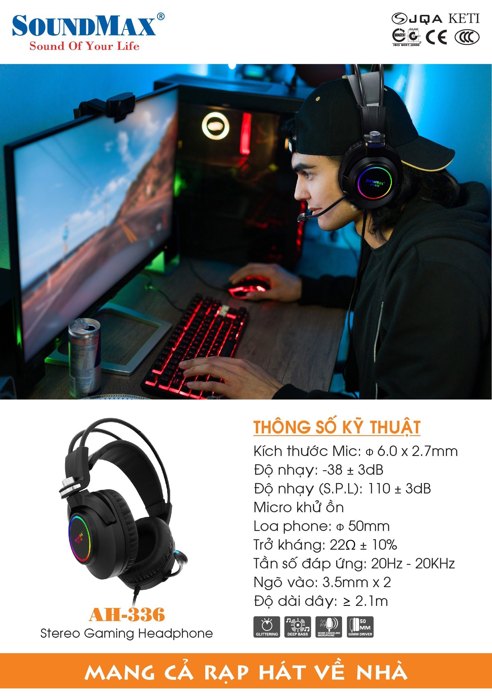 Về mặt kỹ thuật, SoundMax AH-336 được trang bị driver đường kính 50mm đáp ứng dải tần từ 20Hz đến 20.000Hz và có trở kháng 22 Ohm.