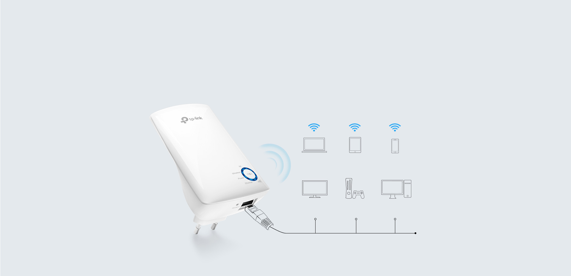 Cổng Ethernet trên TL-WA850RE cho phép thiết bị hoạt động như một bộ chuyển đổi không dây để kết nối các thiết bị có dây như máy nghe nhạc Blu-ray ®, chơi game console, DVR và TV Internet. Đồng thời, tại cùng thời điểm thiết bị có thể chia sẻ mạng không dây.