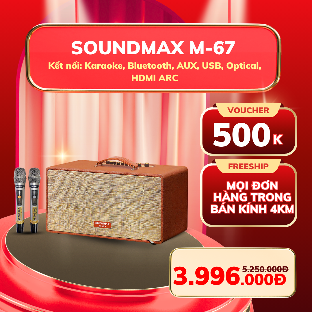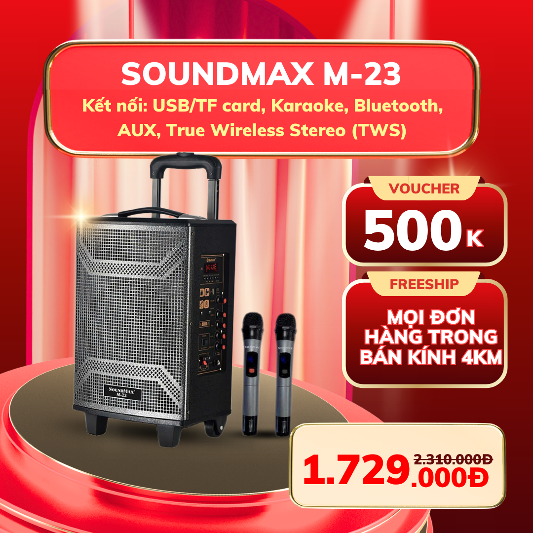 SoundMax M23 có thiết kế nhỏ gọn, tích hợp đầy đủ tính năng giải trí. Sản phẩm hỗ trợ 2 micro không dây, phù hợp nhu cầu karaoke gia đình.